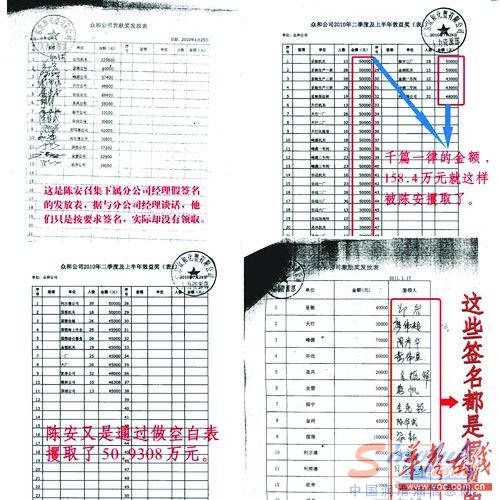 文件复印件显示,2010年1月25日,一份“众和公司贡献奖发放表”中,累计发放资金822000元。“这是陈安召集下属分公司经理签名的发放表,据与分公司经理谈话,他们只是按要求签名,实际却没有领取。”作者以红色字体如是注释。