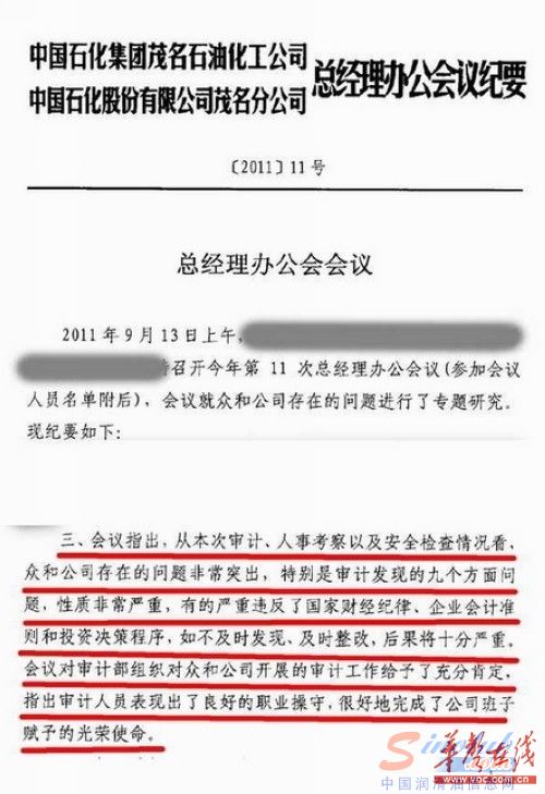 帖文作者提供的一份《中国石化集团茂名石油化工公司总经理办公会议纪要》复印件显示,2011年9月13日,曾就众和公司存在的问题进行了专题研究。