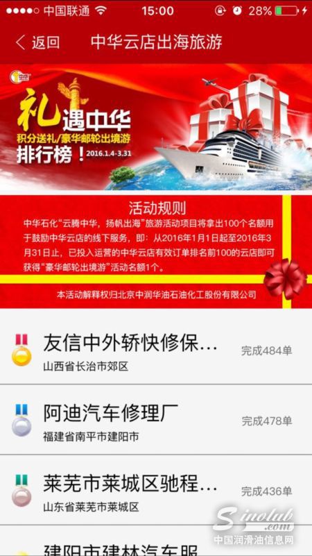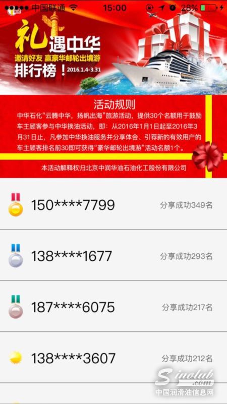 除了对中华云店,在消费者层面,中华石化也拿出了30个邮轮出国游的名额,奖励那些通过分享经历、推荐好友在中华换油网下单数量位列前30的终端用户。