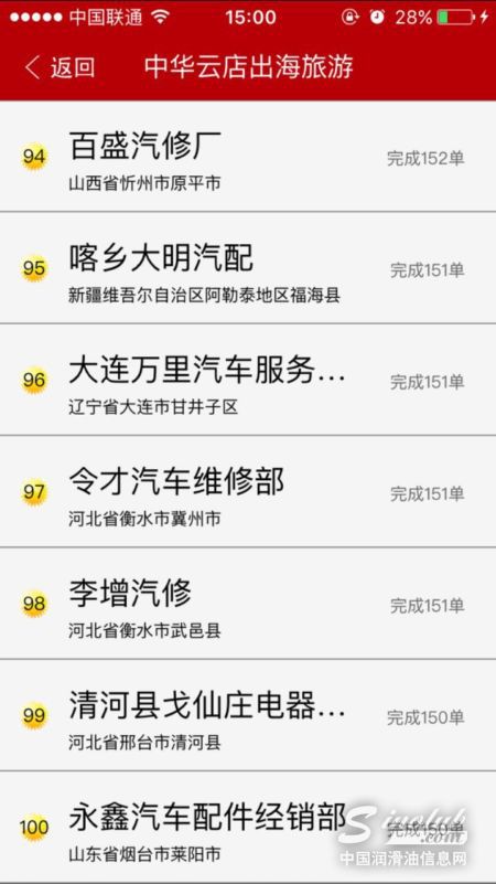 果不其然,春节过后,一拔接一拔的车主因为看中了中华云店促销政策的诱惑力, 不仅自己从网上下单,还窜掇周围亲朋好友也在中华换油网上下订单。店老板一见这阵势,深信今年中华润滑油销量一定会翻好几番,于是果断从经销商那里主动进货,一个季度不到,每家店都进了上万元甚至几万元的中华产品!