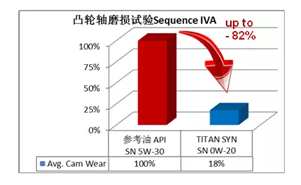 在程序IV A凸轮轴抗磨损试验中,TITAN SYN SN 0W-20相比API SN/ILSAC GF-5 SAE 5W-30的标准油下降了82%。