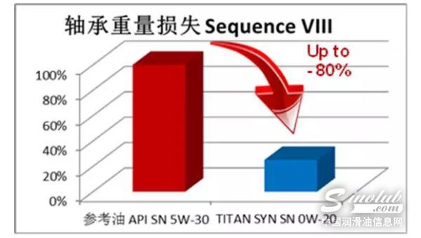 程序VIII中轴承磨损试验中,TITAN SYN SN 0W-20相比API SN / ILSACGF-5 SAE 5W-30的标准油下降了80%。