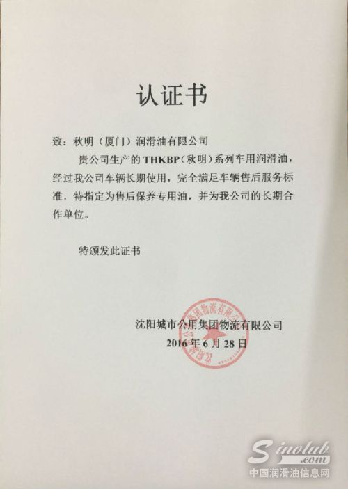 秋明车用油系列在使用过程中,得到了广大车友们的一致好评。同时也为了让更多的车友们了解到秋明润滑油的优质性能,辽宁省沈阳城市公用集团物流有限公司特地为秋明润滑油高贵品质作出了一份认证书。通过这份认证书,让更多的车友们了秋明润滑油并加入到用户队伍中来。