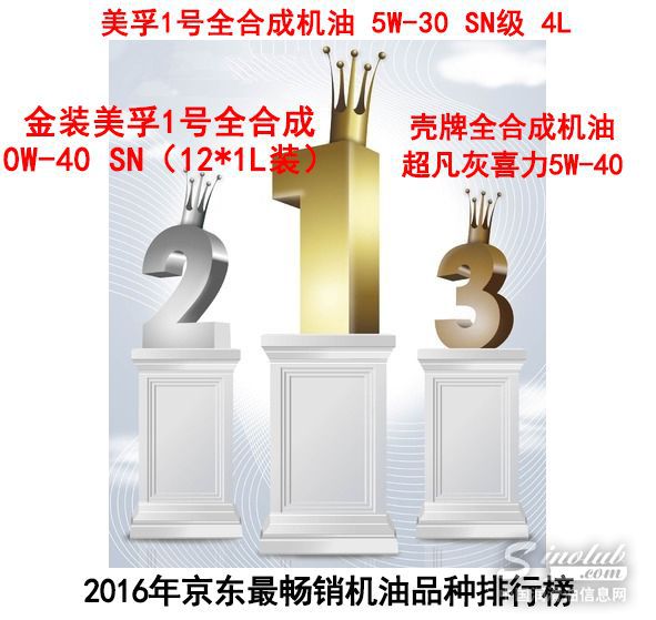 2016年,京东电商平台自营机油销量排行榜冠军是“美孚(Mobil)美孚1号全合成机油 5W-30 SN级 4L”,排名第二位的则是“美孚(Mobil)金装美孚1号全合成机油 0W-40 SN级 12*1L”,“壳牌(Shell)全合成机油 超凡灰喜力Helix Ultra 5W-40”排名第三。通观本年度各月份京东销量排行榜,美孚、壳牌等国际一线品牌一直稳居平台销量前列。