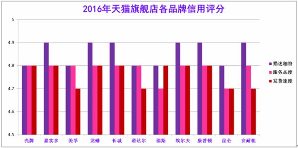 2016年畅销机油天猫旗舰店的信用评分基本保持稳定。无论是产品描述相符程度,还是商家服务态度或发货速度,均维持在较高的分数水平。从打分和评价上可以看出,消费者对于官方旗舰店有较高的信任度,相信产品的品质,并且对咨询、购买及售后的整个流程基本满意。从消费者评价来看,大多期望加大产品促销力度,丰富完善现有的线上服务,提高服务质量。