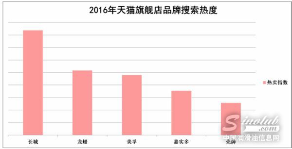 机油品牌的知名度在某种程度上影响着天猫旗舰店热度搜索排行。根据机油猫(m.sinolub.com)电商数据中心统计,2016年,中国知名自主品牌“长城”凭借其不俗的销量和影响力获得搜索热度榜冠军,行业黑马“龙蟠”紧随其后,国际大牌“美孚”排在第三位。可以看出,自主润滑油品牌在消费者群体中的关注度持续升温,在新的一年里潜力巨大。