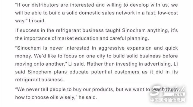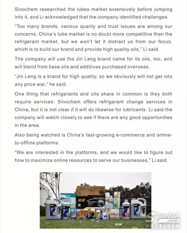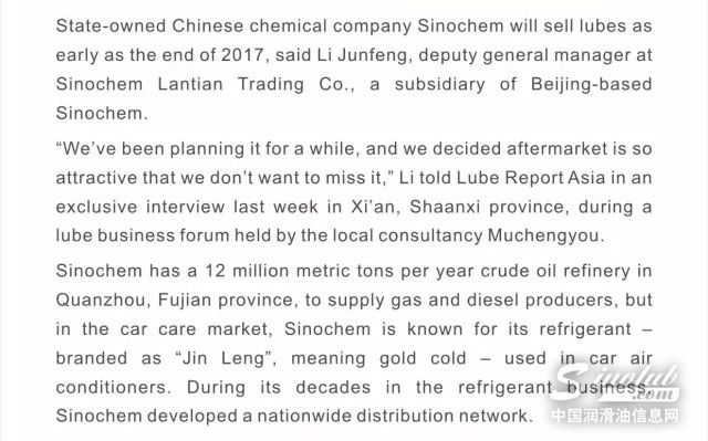 做高品质润滑油——中化集团计划将于2017年底推出“金冷”品牌润滑油。