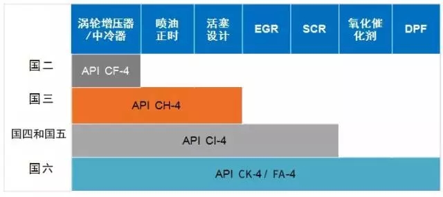 虽然发动机的硬件设计和润滑油的规格之间没有绝对一一对应的关系,但对于建议润滑油的最低规格还是可以和发动机硬件技术和排放标准之间找到大致的参考关系。如下图所示,涡轮增压和中冷器的国二标准对应着API CF-4规格;到了国三后喷油正时和活塞设计的改变得到广泛应用,此时API CH-4规格应为国三时代车辆机油选择的最低标准;随着EGR、SCR、氧化催化剂和DPF在国四、国五和国六硬件中大量得到应用,更高规格的API CI-4、CJ-4和CK-4理应成为车辆机油的规格基准。
