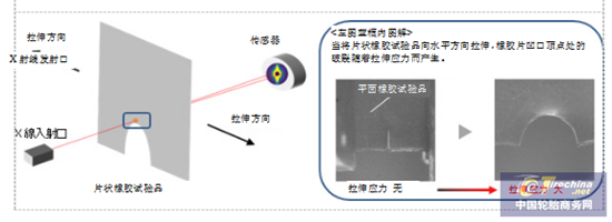 将带有凹口的片状合成橡胶试验品沿水平方向拉伸,用X射线小角散射法观察凹口顶点处橡胶内部“孔洞”的形成和增大情况。
