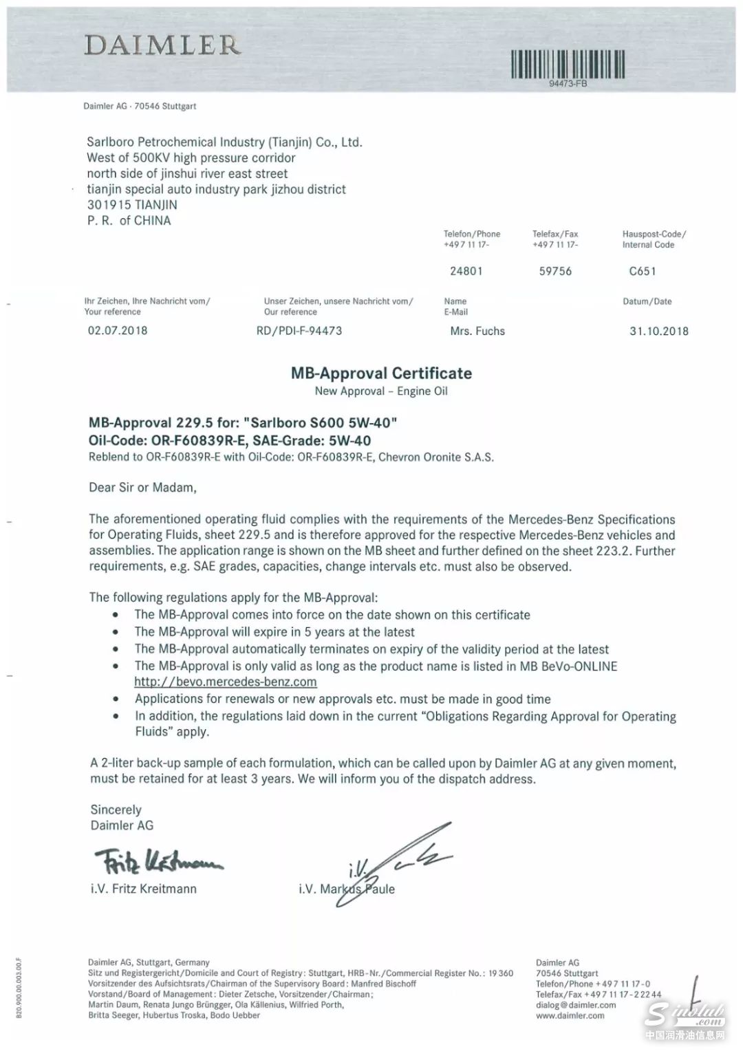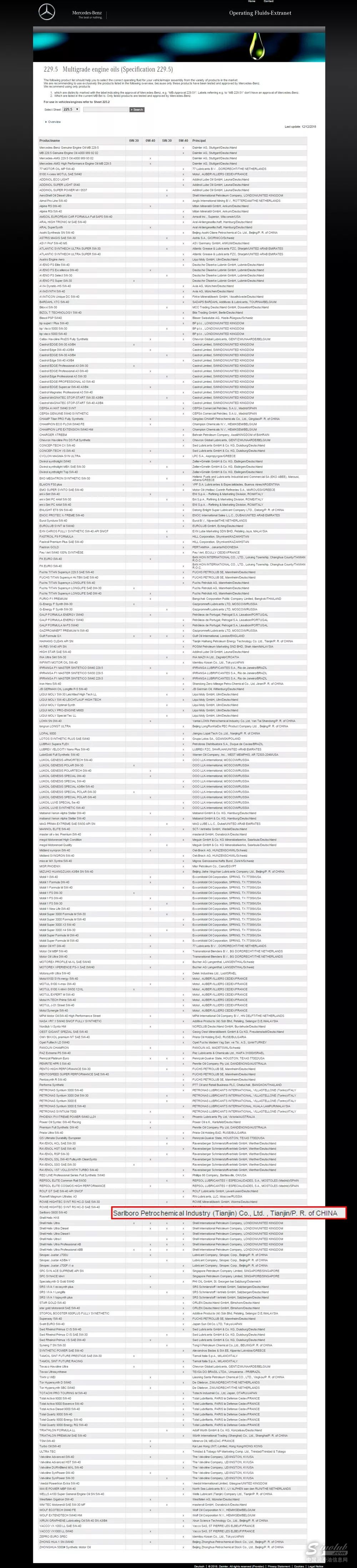下图为MB 229.5认证机油名录,标红为圣保路润滑油,该名录公布于奔驰官网