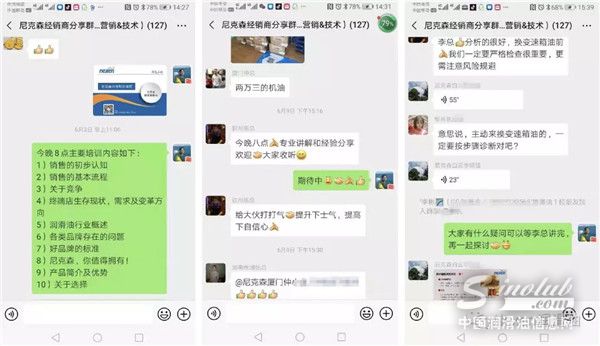 最后是渠道的发展。想要渠道快速增长,就得赋能。赋能做的好,合作代理商才能发展得快,也更容易形成口碑,继而也便于下一步的招商。Nexen厂家主动建立了代理商交流群,把所有合作代理商及其业务经理拉入群内,一起探讨市场策略,交流经验,并不定期通过群分享的形式把厂家的市场思路,销售策略及落地方案等不打折扣的分享给Nexen代理商及其业务经理,比如我们通过群分享过的主题有《如何选择靠谱的润滑油品牌》《90天启动新市场》《波箱油项目的注意事项》《如何介绍公司和产品》《赋能终端:如何集客和锁客》等等。通过设置优秀素材奖(一切与Nexen相关的图片或视频),并每天在群内发奖励及做互动来保持群的活跃度。