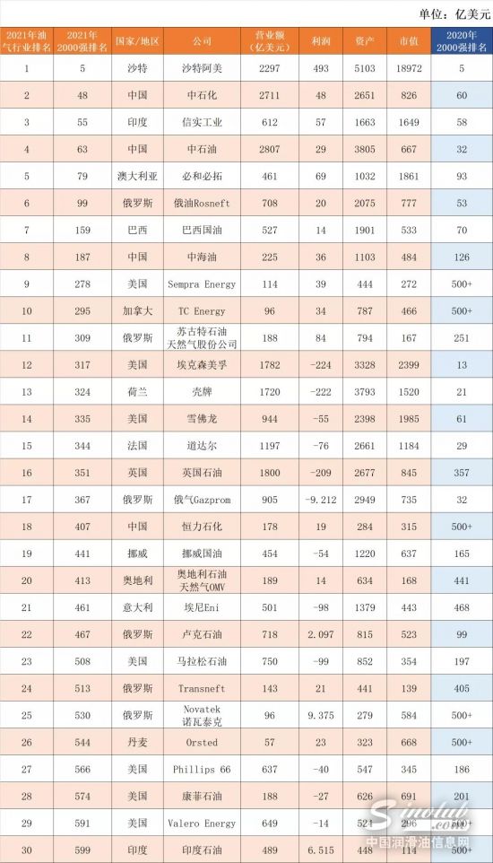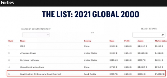 此外,去年的福布斯2000强的前500名里,共计31家石油天然气企业上榜,2021年,仅22家企业上榜。“巨无霸”沙特阿美仍然是今年福布斯2000强榜单中唯一一家进入TOP 10的石油公司。