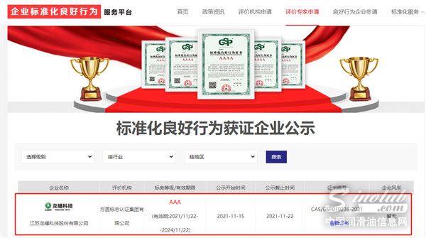 近日,龙蟠科技成功通过标准化良好行为评价。经认证,龙蟠建立的标准体系符合国家相关标准要求,达到AAA等级。