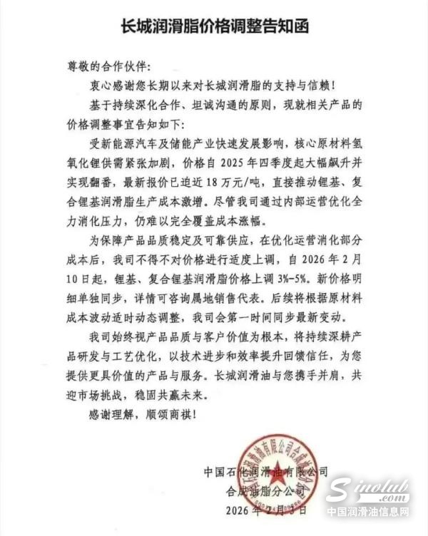 这是今年以来润滑脂领域较为明确的一次价格调整。