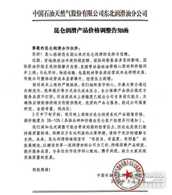 因此将于 3月中下旬开始上调部分昆仑润滑系列产品价格,