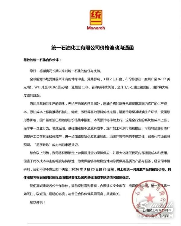 近期,国际原油价格持续上行,基础油、添加剂等核心原材料成本明显上涨。中国润滑油信息网注意到,包括长城润滑脂、昆仑润滑、统一石化以及部分地方品牌在内,多家企业已陆续发布价格调整或涨价预告。业内普遍判断,新一轮润滑油价格周期可能正在形成,市场或将迎来阶段性备货窗口。