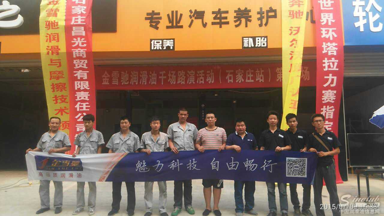 2015年7月8-10日,为期三天的“金雪驰润滑油‘千场路演计划’十万人品质见证之旅”转战河北,在石家庄市隆重拉开帷幕,本次路演主题为“感恩回馈——金雪驰买油送油(买机油送发动机清洗油),活动现场还送免费洗车服务,同时更换机油送机滤!”金雪驰润滑油携手经销商(石家庄昌光商贸有限公司)共启动6家终端修理厂为石家庄的司机朋友们提供一场爱车养护盛宴,意在以贴近式服务、面对面沟通、多重免费服务倾情回报金雪驰润滑油的“铁杆粉丝”,给新老客户一次“亲密接触”的机会,反响热烈,赢得当地经销商和驾驶员朋友们的广泛赞誉。