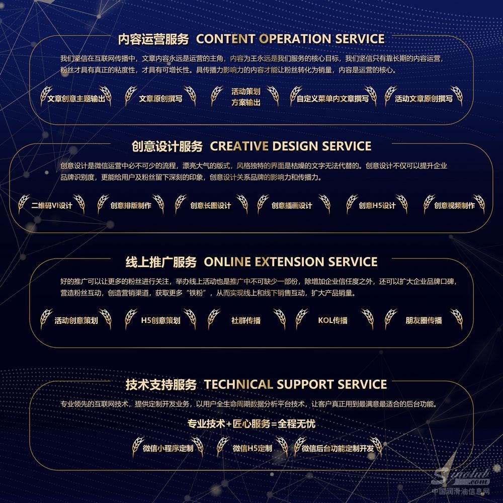 作为世界500强企业的优选服务商,我们秉持“品牌优选、优选品牌”的价值理念,以中国最具影响力的润滑油行业平台为企业提供互联网品牌策划和营销服务。我们致力于成为润滑油行业卓越的全媒体数字信息运营商,以用户和市场为中心,以技术和内容为驱动,实现中国润滑油信息网、《润滑油信息》电子周刊、《润滑油市场》杂志、润滑油行业APP、微博、微信等线上线下传播资源的全方位良性互动。