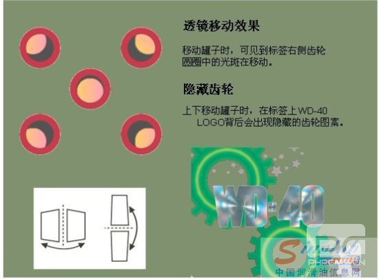 该标签为德国的光学防伪标签工厂独家制造,采用多项技术唯一的光学防伪特征组合而成,具有不可复制性。且该标签只能使用一次,张贴后若被撕下即被破坏,完全消除了被盗用的可能性。为更好地帮助消费者识别原装正品,WD-40中国公司籍由两大措施增强标签的可视性辨别功能:透镜移动效果、隐藏齿轮浮雕