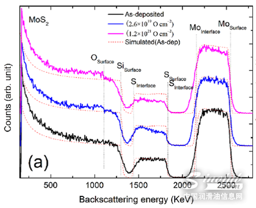 图1 纯MoS2薄膜原子氧辐照前后卢瑟福背散射图谱
