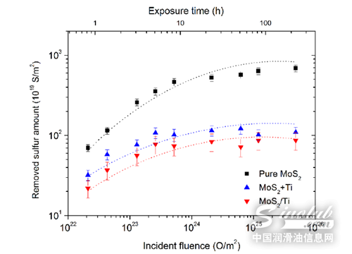 图3 不同结构MoS2薄膜硫元素损失与原子氧辐照计量函数关系