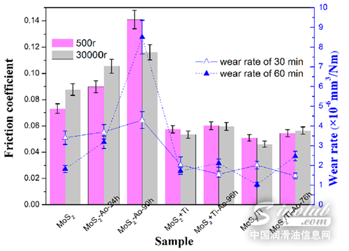 图4 不同结构MoS2薄膜原子氧辐照前后摩擦学性能测试