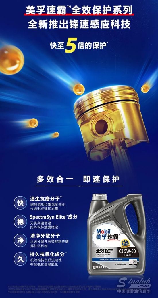 近日,美孚速霸™全效保护系列全新推出锋速感应科技,速生抗磨份子™敏锐感知引擎温度变化,快速形成强韧油膜;SpectraSyn Elite™成分无畏高温低温,保持油膜稳定;清净分散分子及持久抗氧化成分即速相应工况变化。快至5倍的锋速感应,给保护摁下快进键,与您一路如影随形。