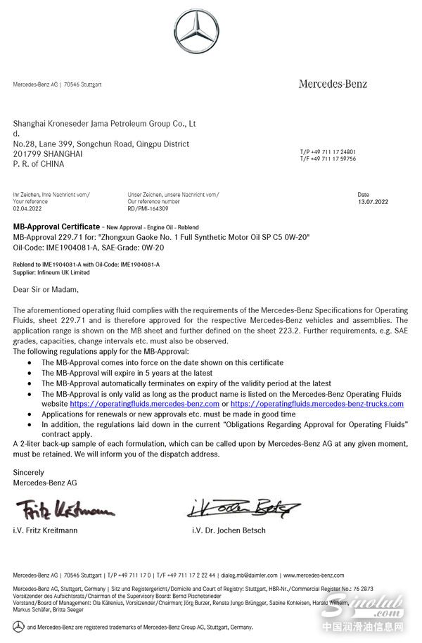 日前,以“绿色高科,低碳润滑”为发展理念的中讯高科润滑油再获得行业中的一份过硬的认证证书,即著名的Mercedes-Benz(梅赛德斯-奔驰)机油认证。对于中讯高科投资集团来说,虽是一份日常工作的一个缩影或一个镜头,但反映了中讯高科品牌团队对“绿色润滑”持之以恒的不懈追求,及业界包括高端车辆厂家对该品牌一直以来的认可和赞许。