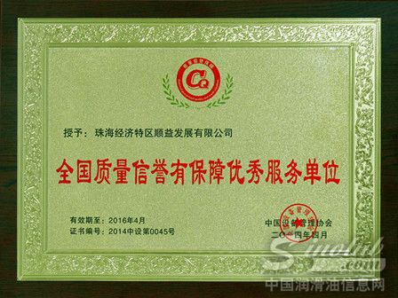 2014年4月,珠海经济特区顺益发展有限公司荣获中国设备管理协会颁发"全国质量信誉有保障优秀服务单位",20多年来,顺益一直坚持重信誉...[详情]