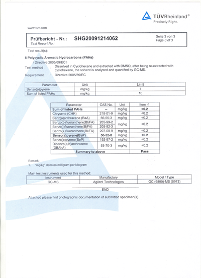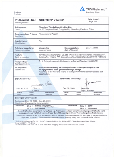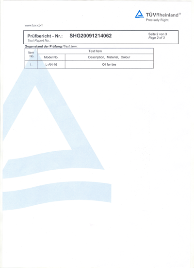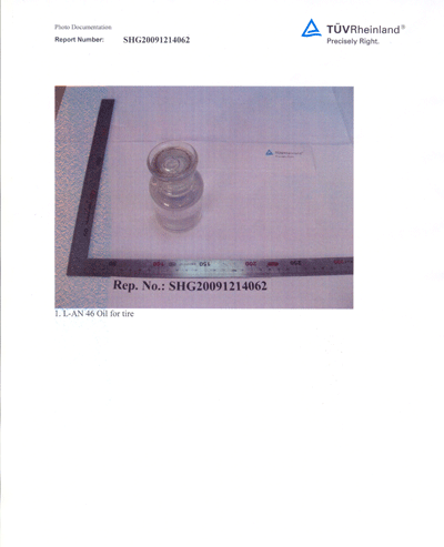 山东源根石油化工有限公司从2008年初,就致力于该类产品的研究和开发,到2009年底已形成了稳定可靠的生产技术和工艺,通过对基础油的特殊脱毒处理,研制出了质量达标的生产出口橡胶制品、橡塑制品及尼龙件制品等使用的46#AN机械油。该油的Benzo(a)Pyrene检测结果为<0.2mg/kg(标准为少于1mg/kg),而PAHS的检测结果为<0.2mg/kg(标准为少于10mg/kg),公司研发的这类橡胶制品专用机械油现已顺利通过欧盟认可检测。其具体检验报告如下: