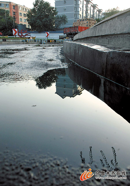 9月11日19时49分,泄漏在新疆乌鲁木齐市河滩路新医路立交桥西南匝道路面上的润滑油。