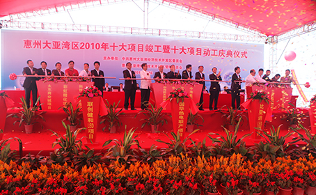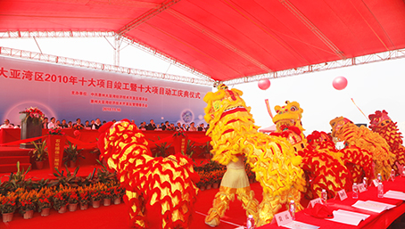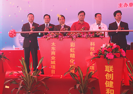 11月16日上午,艳阳熙暧,和风送爽,广东大亚湾开发区内气球高悬、彩旗飘扬;铺设着红地毯的高大舞台下鼓乐喧天、醒狮欢舞,洋溢着热情喜悦的气氛,惠州大亚湾经济技术开发区2010年十大项目竣工暨十大项目动工庆典仪式在此隆重举行。广东省社会科学院院长、研究员梁桂全,惠州市委书记、市人大常委会主任黄业斌,惠州市委副书记、市长李汝求等省、市领导出席了庆典仪式。彩虹精化董事长陈永弟先生作为十大动工项目嘉宾代表,于主席台就座,和省、市领导一起启动了象征项目动工的拉杆仪式,并出席了招待午宴。