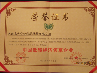 在该论坛上,天津东方舜能润滑材料有限公司荣获了由中国生产力学会、中国国防科技工业企业管理协会、联合国全球契约组织、国际低碳经济研究中心共同授予的“中国低碳经济领军企业”称号,同时被选入《军工节能减排技术(产品)供应商目录》。