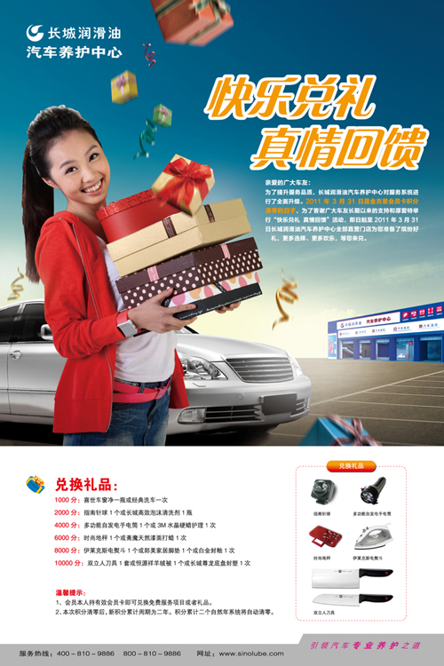 为了提升服务品质,长城润滑油汽车养护中心对服务系统进行了全面升级。2011年3月31日是金吉星会员卡积分清零的日子,为了答谢广大车友长期以来的支持和厚爱,长城润滑油汽车养护中心特举行“快乐兑礼 真情回馈”活动,从即日起至2011年3月31日,长城润滑油汽车养护中心全部直营门店为您准备了缤纷好礼,更多选择、更多欢乐,等您来!