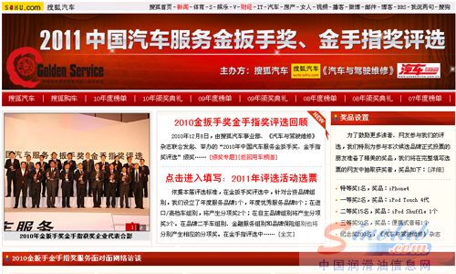 近日,由搜狐汽车事业部、《汽车与驾驶维修》杂志联合发起、举办的 “2011中国汽车服务金扳手奖、金手指奖评选”活动拉开大幕。活动坚持以“打造中国汽车服务价值坐标系”为目标,为中国消费者的购车和用车养车消费提供权威参考。