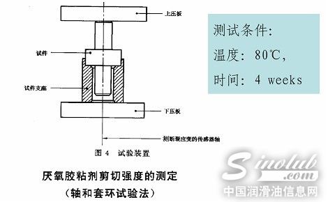 首先将轴和套环按照标准的要求,通过液体密封胶进行胶结,在测定的环境条件下放置与被测试的油品中,达到28天后将胶合件取出,将轴和套环组装件放入钢制试件支座内,并将支座放在试验装置上。以一个恒定的位移速度(1mm/min-2 mm/min)给试件平稳加载压力。记下最大载荷(N),计算静态剪切强度t,公式如下:
