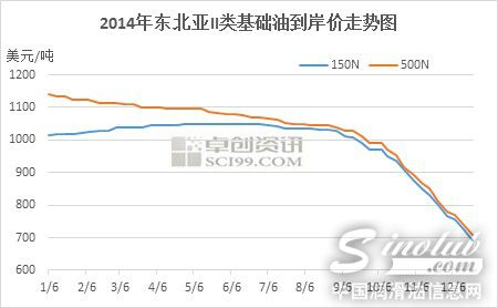 6月中旬以来,国际原油价格不断下滑,基础油外盘价格跌跌不休,9月份以来更是持续“跳水”,跌势惨不忍睹。据卓创资讯数据统计,截至12月22日当周,东北亚II类150N到岸均价在690美元/吨,较年内高点大幅下跌360美元/吨,跌幅34.29%。