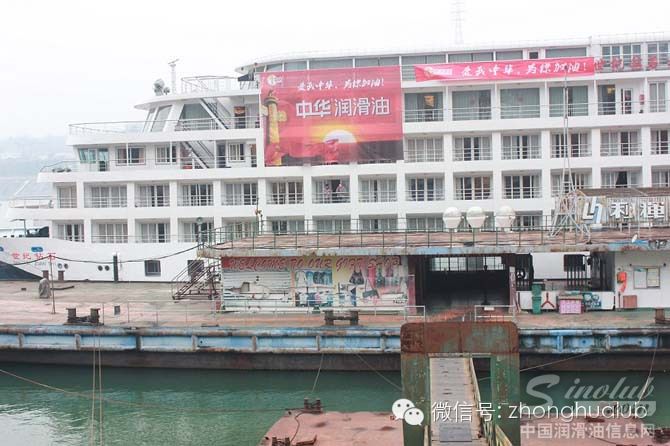 图1:中华.世纪钻石游轮在三峡大坝脚下的著名的移民村——三斗坪镇靠岸。经销商们即将离船乘大巴前往三峡大坝景区游览。