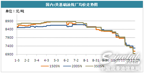 三季度 "金九银十" 传统润滑油销售旺季来临,但下游需求萎靡不振影响,呈现"旺季不旺"的局面。9月之后,受国际原油价格大幅下行影响,国内基础油贸易商降价促销的迫切期望和下游操作意向低迷的心态,导致基础油市场的交投氛围冷清。