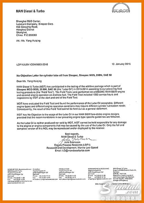 MAN公司和WARTSILA公司在世界船用二冲程柴油机业务中排名为前两位,占据了绝大部分的市场。Sinopec气缸油5025先后获得两大公司的技术认证,为Sinopec润滑油在ECA地区的船用油市场推广以及提升市场占有率创造了十分有利的条件。