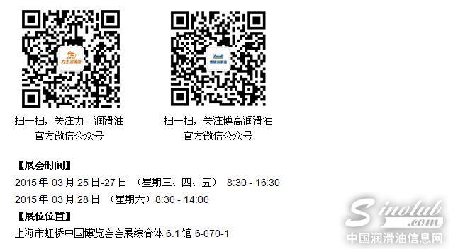 叶氏润滑油展示产品为【博高】金属加工、设备油、润滑脂、喷剂、【力士】车用油及工业油五大系列。现场将会进行品牌微信公众号互动、客户问卷调查等活动,欢迎各位参展商及同行关注。