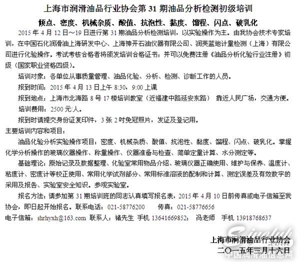 上海市润滑油品行业协会第31期油品分析检测初级培训