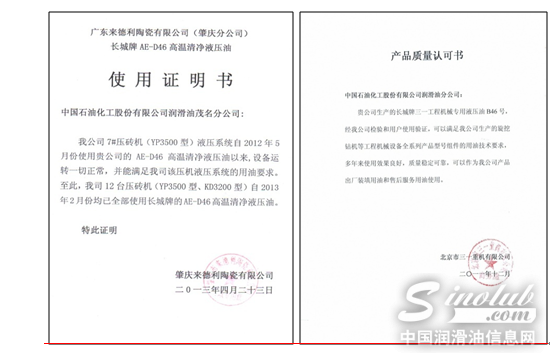 凭借多种产品选择和优异的性能表现,长城润滑油的高端系列AE液压油得到来自业内人士及客户的广泛好评。天津钢管制造有限公司的套管线上料液压站就对长城润滑油的AE32液压油的综合性能给予高度肯定,该液压站使用AE 32液压油采用整体切换的方式替代了原液压油,设备运行状态非常顺畅,效果令人满意。作为佛山陶瓷行业中具有影响力的陶瓷厂商,广东来德利陶瓷有限公司也对长城的AE液压油赞赏有加, AE-D46高温清净液压油自2012年在该公司液压系统进行开始试用以来,设备运转一切正常,完全满足该压砖机液压系统的用油要求,目前该公司12台压砖机全部使用长城AE-D46高温清净液压油。此外,AE46液压油自2009年起还用于三一重工SR系列旋挖钻机,三一重工对该产品的使用效果非常满意,其性能可充分满足了该公司产品的使用要求,该产品于2011年底,获得该液压油在三一重工旋挖钻机系列产品上应用的质量认可。