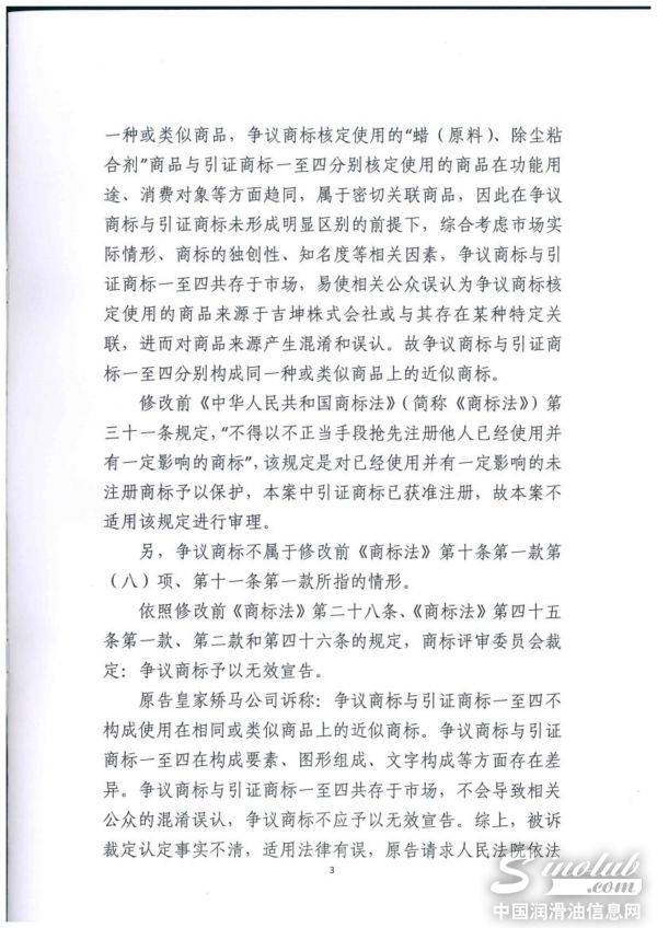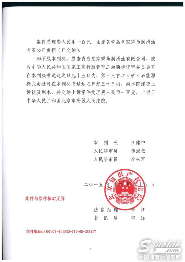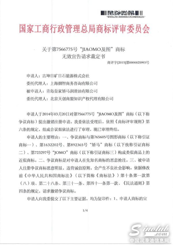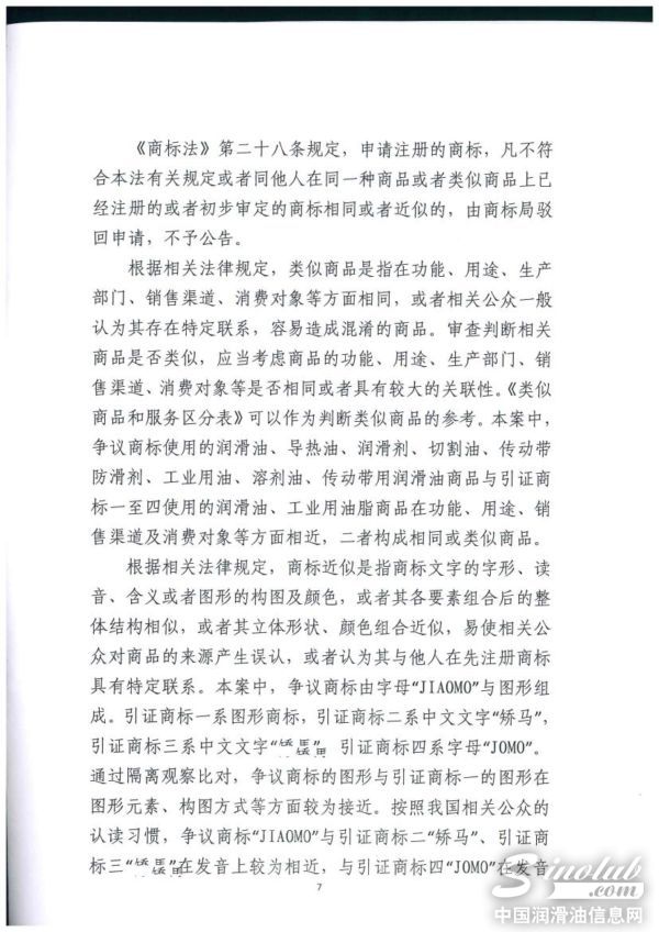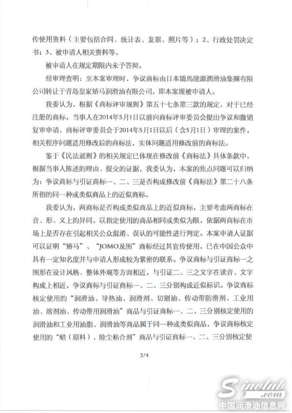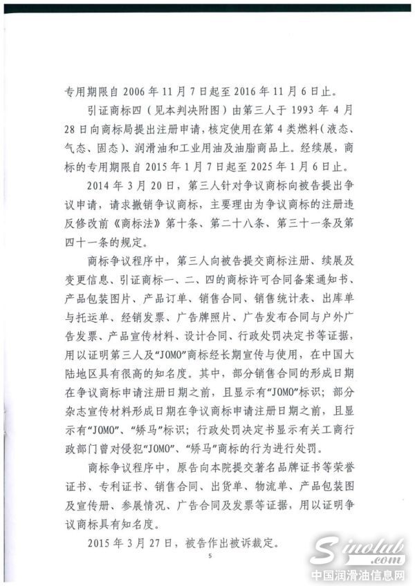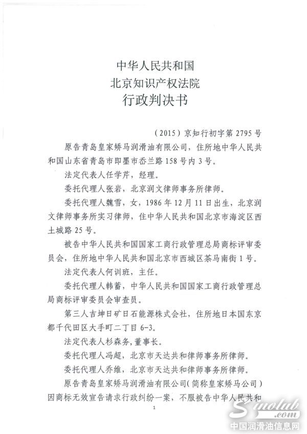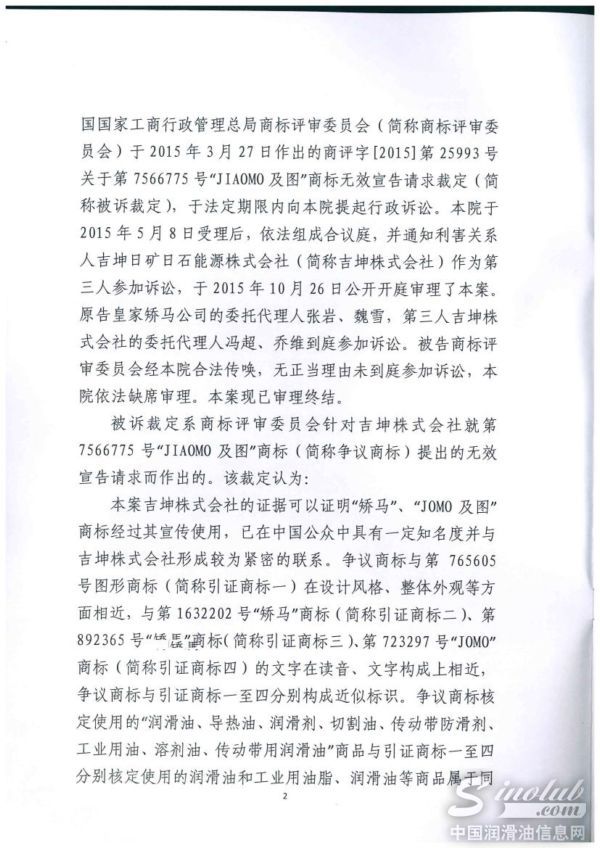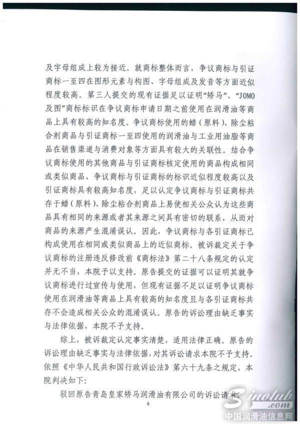 2015年12月28日,北京知识产权法院作出判决:驳回青岛皇家矫马润滑油有限公司的诉讼请求,支持国家工商行政管理总局商标委员会的裁定,认为:“JIAOMO及图”商标与“矫马”、“JOMO及图”商标在类似或相同商品上构成近似商标。
