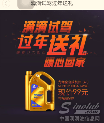 本月20日-22日,龙蟠润滑油与滴滴试驾全面合作,在滴滴试驾页面的“商城”频道全面开展“过年回家 滴滴有礼”的全合成机油贺岁优惠活动。活动期间,北京、上海、广州、深圳、成都、杭州六座城市的滴滴用户,购买龙蟠全合成机油即可享受99元的惊喜特价, 同时还可以获得包括轮胎驱犬剂、魔方导航支架、包饺子神器、旅途应急尿袋等实用礼品在内的春节大礼包!