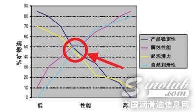 矿物油含量越低,起泡可能性越高,多且持久的泡沫会影响切削液及其润滑性能。因此,为了进一步确定“平衡点”,将起泡潜力与配方中矿物油含量的关系曲线,以及润滑与起泡的关系曲线叠加到之前的示意图,我们就会发现,矿物油含量若在40%-55%这个区间,可以实现起泡与润滑的最佳平衡(如图2所示)。