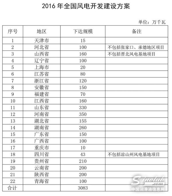 一、为保持风电开发建设节奏,促进风电产业持续健康发展,2016年全国风电开发建设总规模3083万千瓦。考虑到2015年吉林、黑龙江、内蒙古、甘肃、宁夏、新疆(含兵团)等省(区)弃风限电情况,暂不安排新增项目建设规模,待上述省(区)弃风限电问题有效缓解后另行研究制定。