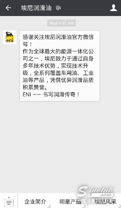 埃尼润滑油中国官方微信平台将充分利用移动互联网技术,以持续运营、用户思维、敏捷迭代、数据为重和简约专注为运营理念,传播埃尼作为国际一流品牌先进的润滑技术和品质理念,走近中国市场用户,加强与经销商合作伙伴的互动,为客户提供优质的服务和技术支持。埃尼中国官方微信平台包括“企业简介”、“明星产品”和“埃尼风采”三大模块。其中,“企业简介”模块包括埃尼品牌介绍、公司官网及埃尼联系方式,针对中国客户全面介绍埃尼的品牌发展历程;“明星产品”模块主要介绍埃尼的车用油和工业油产品,其中的“油我来谈”栏目将定期为客户介绍相关润滑油知识。