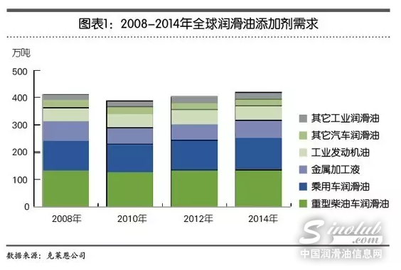 克莱恩公司最新研究报告提出,2014年,添加剂销量占了全球成品润滑油总量3940万吨的11%。全球添加剂市场规模达420万吨,其中包括活性成分和使其更容易与润滑油混合的稀释油。