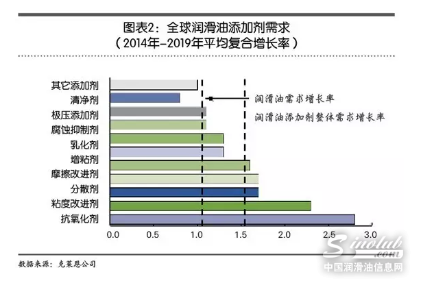 随着润滑油产品性能的升级要求生产商注入高剂量的添加剂,未来几年内,全球润滑油添加剂需求的增长速度预计会比成品润滑油市场更快。克莱恩公司预测:并不是每一种添加剂成分都将出现需求增长,而且某些添加剂的需求增长肯定会快于其他添加剂,如清净剂。